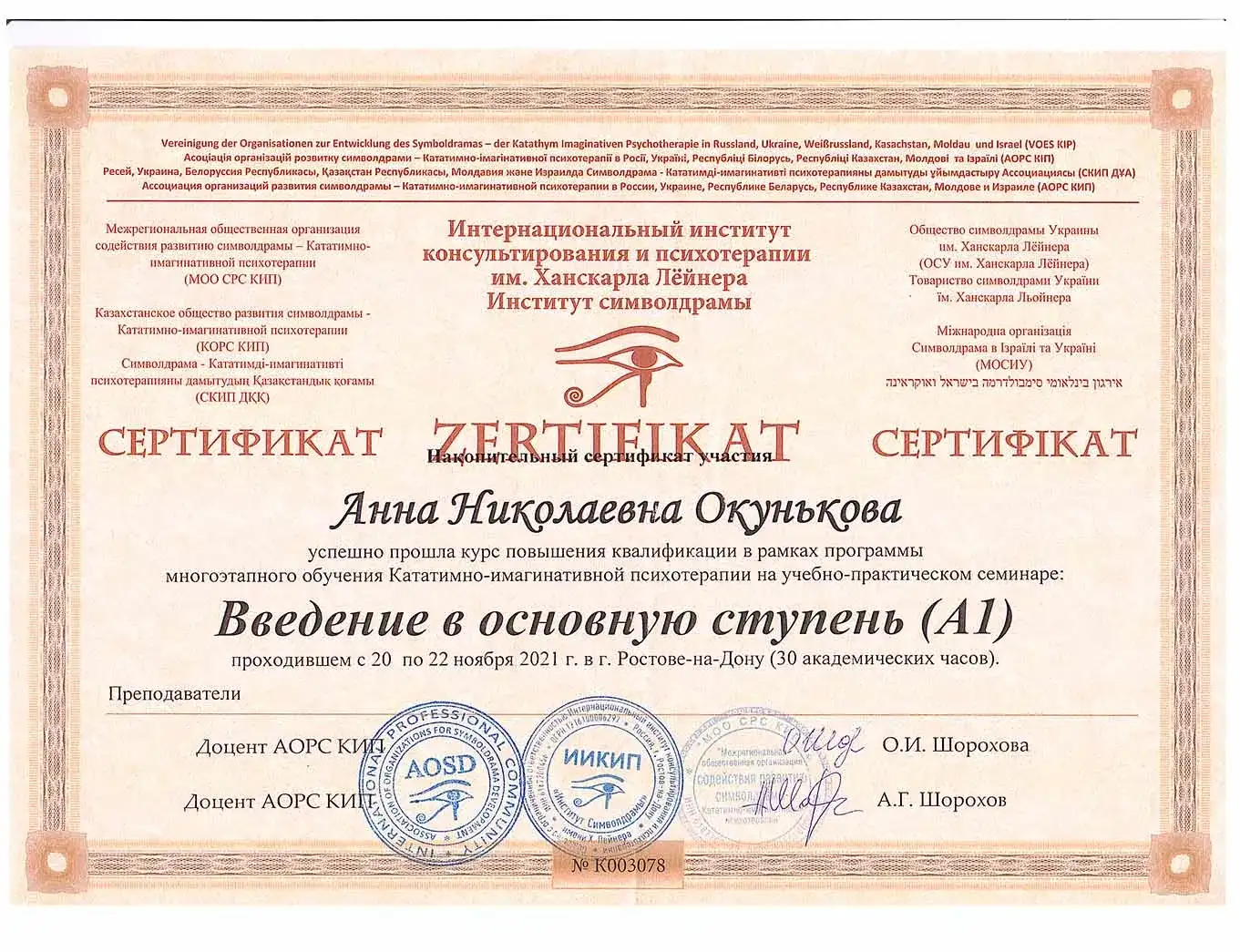 • 2021 - Интернациональный институт консультирования и психотерапии им. Ханскарла Лёйнера. Институт символдрамы (Сертификат о прохождении курса повышения квалификации в рамках программы обучения Кататино-имагинативной психотерапии)